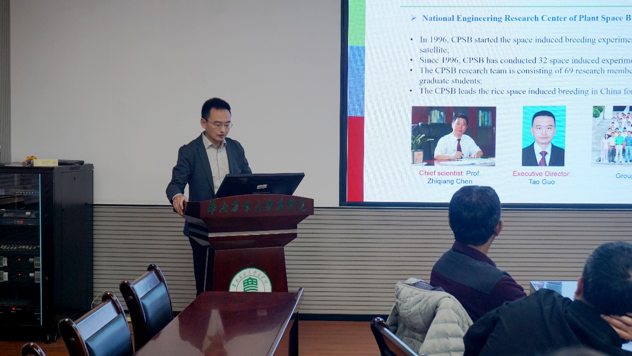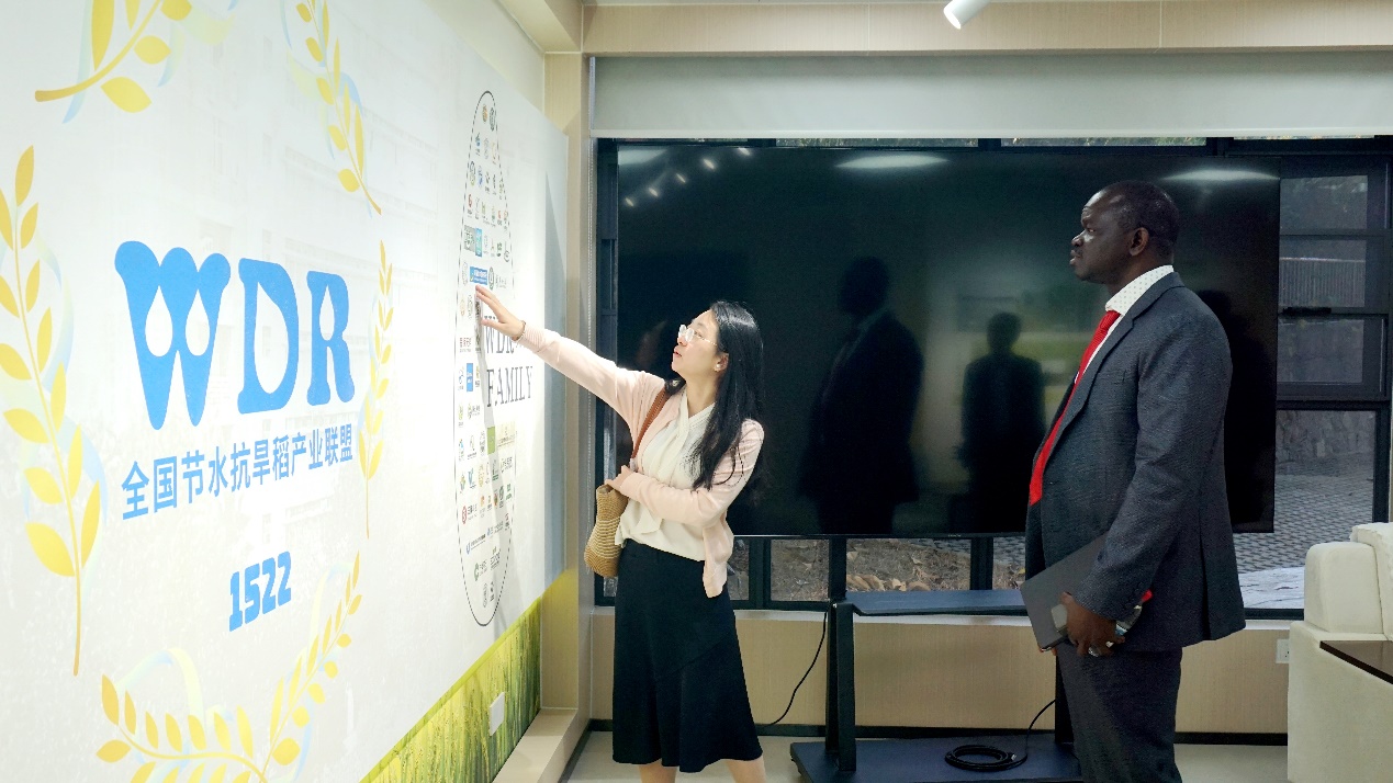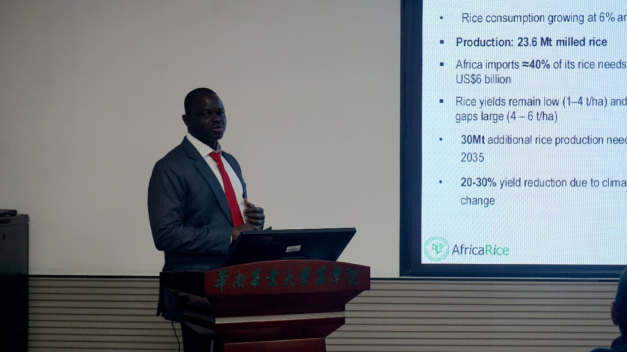 会上,华南农业大学郭涛教授介绍了学校在水稻航天育种研究方面的进展,夏辉教授分享了节水抗旱稻的研究进展,巴布卡尔介绍了非洲水稻中心在分子育种方面的情况。会后,巴布卡尔参观了华南农业大学节水抗旱稻绿色产业研究院。