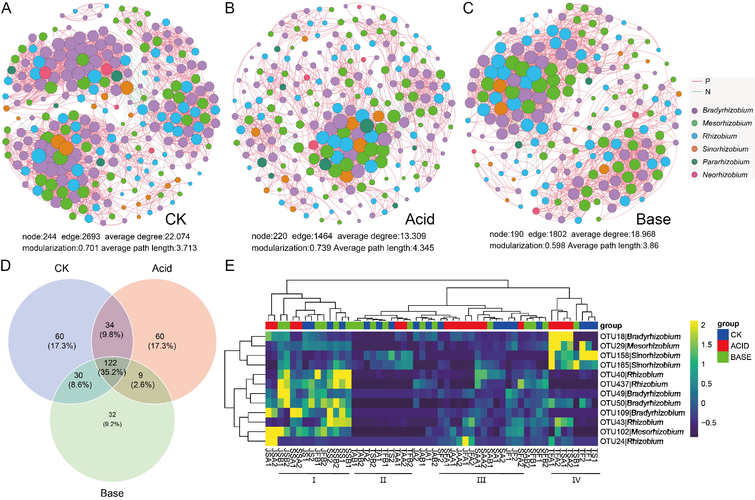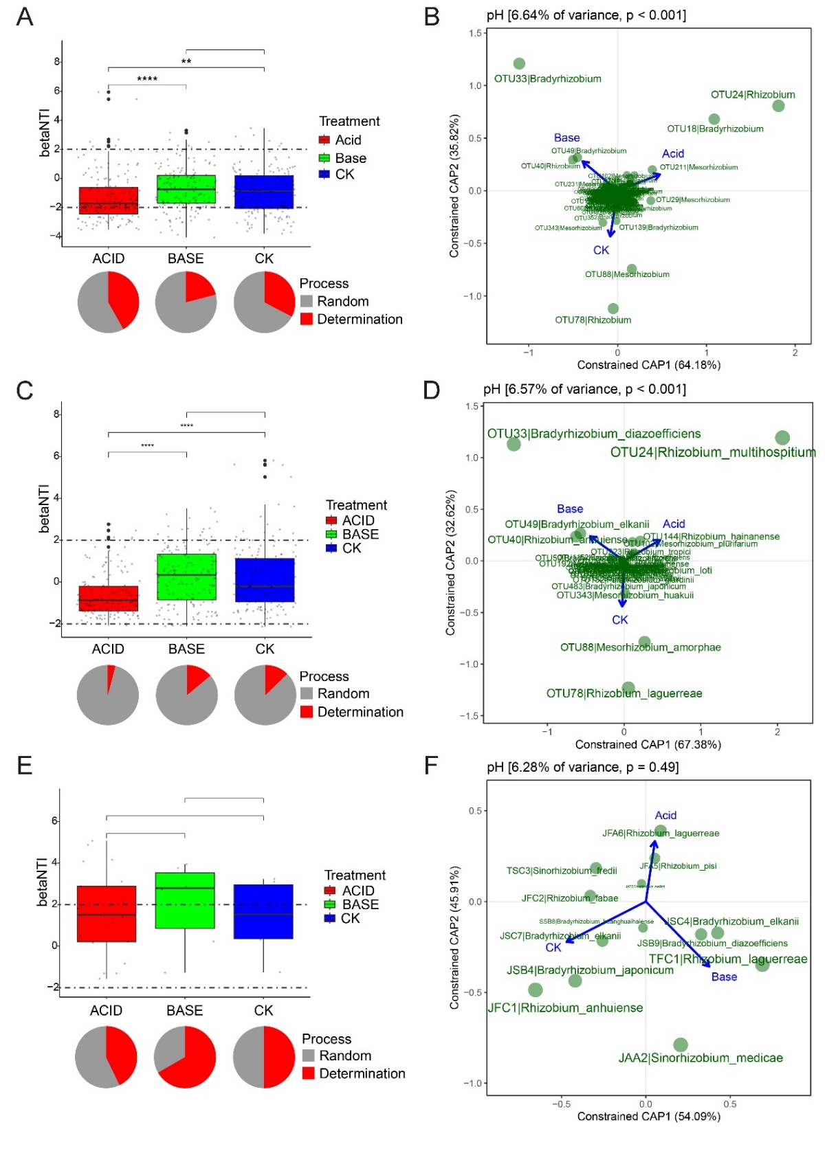 网络分析表明,酸化和碱化处理均减少了共现网络的平均度,简化了群落结构(图3)。iCAMP分析发现,pH变化促进了根瘤菌群落的确定性组装过程(图4)。具体而言,pH变化通过选择性富集pH专性类群加强了确定性选择:酸性条件下富集慢生根瘤菌属,碱性条件下富集根瘤菌属和中慢生根瘤菌属。