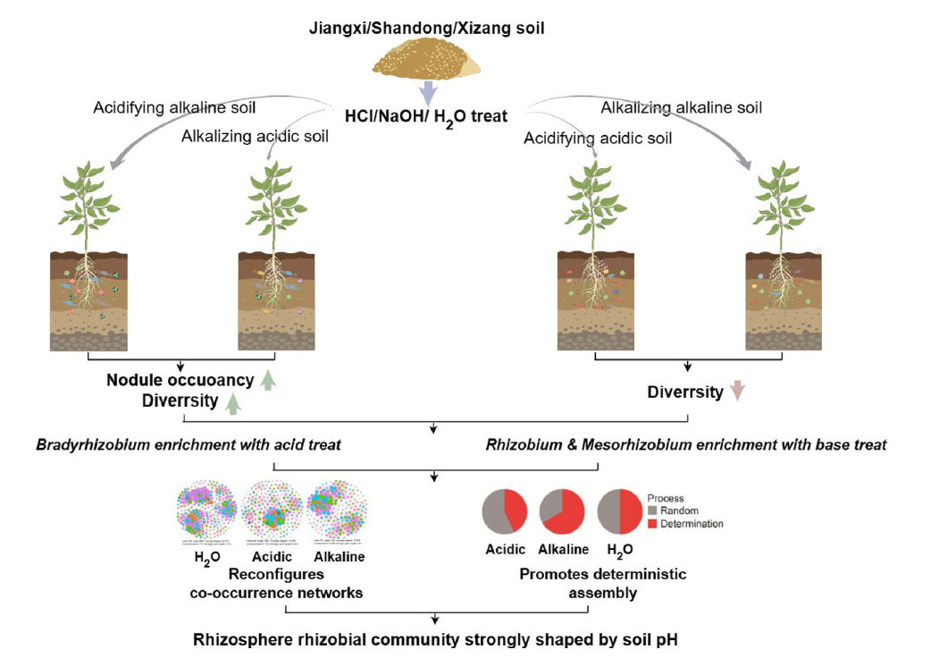 根瘤菌作为豆科植物的共生固氮伙伴,在农业氮循环中扮演着关键角色,贡献了农业系统中65%以上的生物固氮量。然而,与根瘤内根瘤菌的深入研究相比,根际根瘤菌群落的生态驱动因子,特别是在环境扰动下的响应机制尚不明确。土壤pH作为微生物活性的“主调控因子”,对根瘤菌的分布和功能具有重要影响,但其在物种水平上调控根瘤菌群落组装的具体机制仍有待阐明。