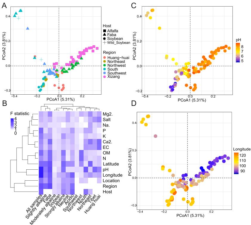 研究团队通过整合3篇已发表论文中rpoB基因高通量测序数据,对135个样本进行了跨区域元分析,揭示了豆科植物根际根瘤菌群落的生物地理格局及其关键驱动因子。PCoA结果分析显示,根瘤菌属的OTUs在根际中没有表现出与特定宿主植物(苜蓿、蚕豆、大豆)的显著关联(图1A),表明严格的宿主特异性过滤可能是根和根瘤生态位的特征,而非根际。相反,样本的分散主要受地理分离解释:来自西北中国(甘肃和青海)和西藏的样本聚集在一起,无论宿主植物为何,这些样本位于PCoA1的右侧(解释总方差的5.31%)(图1A)。PERMANOVA分析识别出土壤pH(F₁,₁₀₂ = 3.69, P < 0.001)和经度(F₁,₁₀₂ = 3.70, P < 0.001)为根瘤菌群落变异的最强预测因子(图1B)。进一步的PCoA分析结果表明经度与土壤pH呈负相关(图1C和D)。