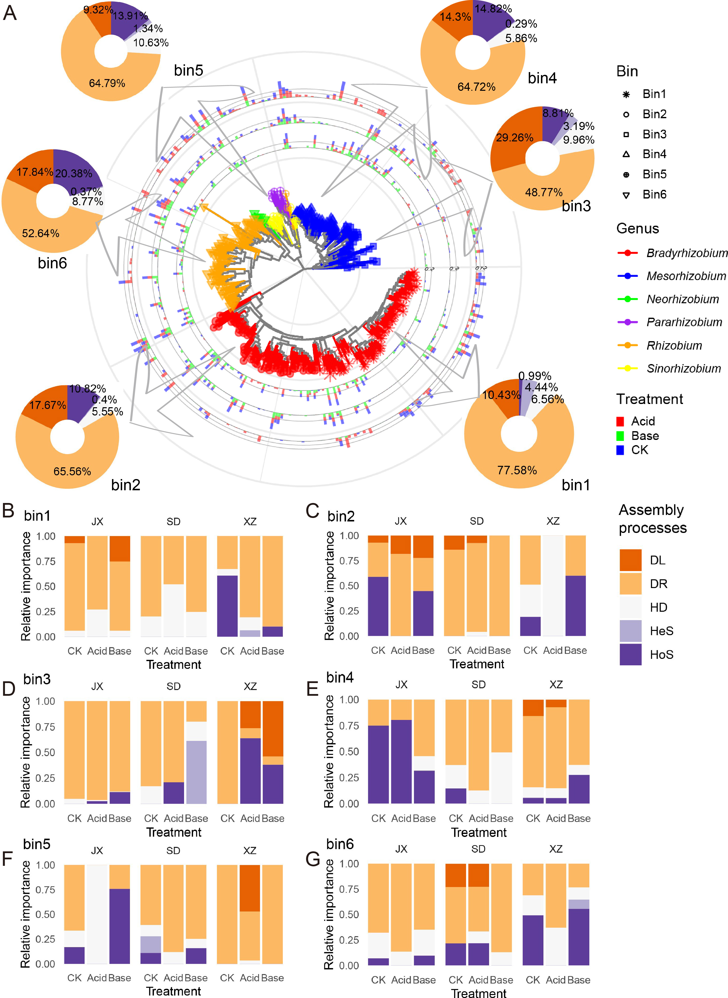 图4.根际根瘤菌群落在pH处理下不同系统发育分支(bin)的组装过程