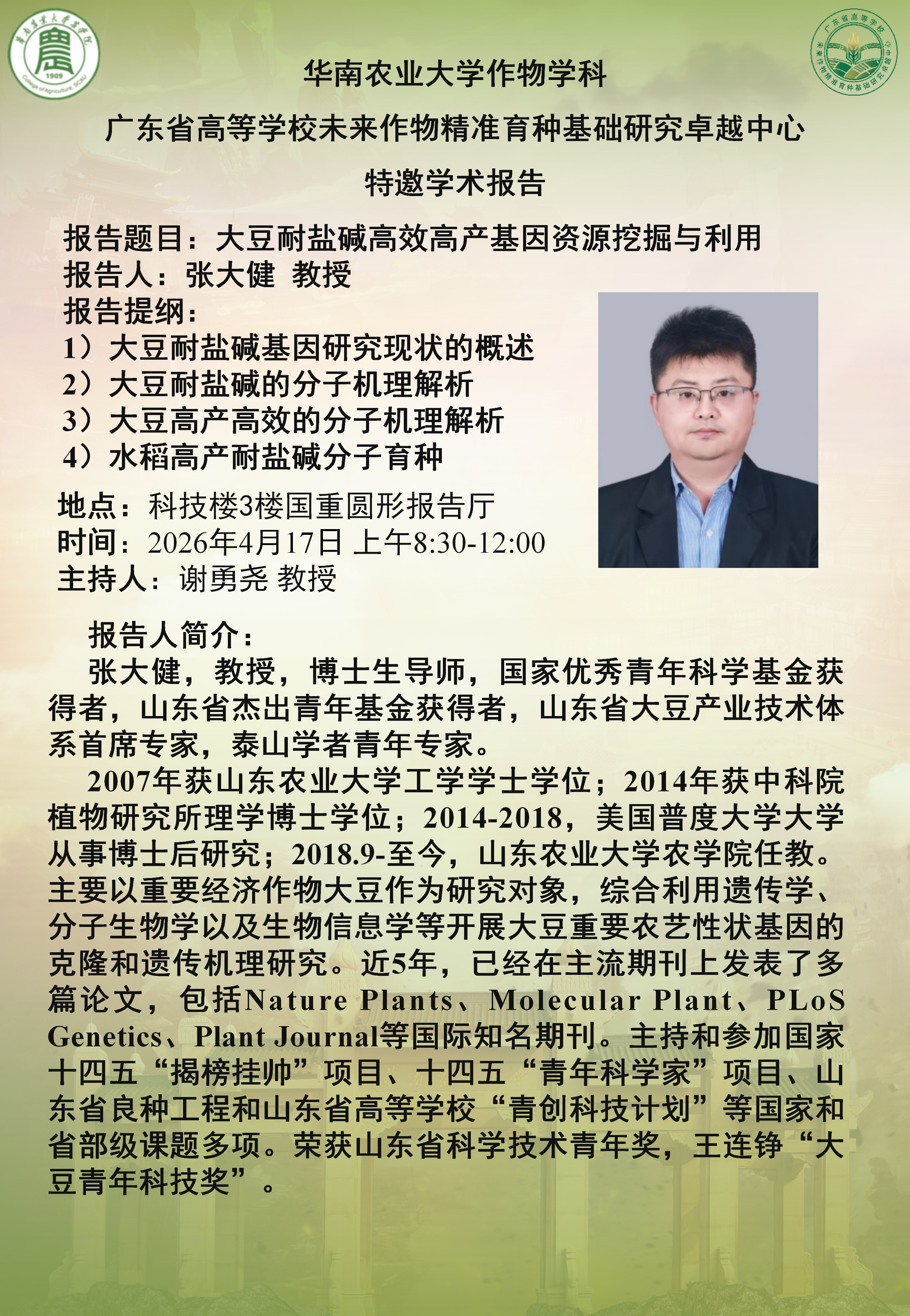 2026年学术报告第8期丨张大健:大豆耐盐碱高效高产基因资源挖掘与利用