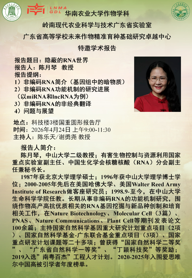 2026年学术报告第10期丨陈月琴:隐蔽的RNA世界