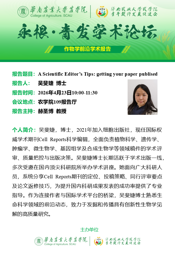 ”永根·青发“作物学前沿学术论坛|吴斐婕:A Scientific Editor's Tips: getting your paper published
