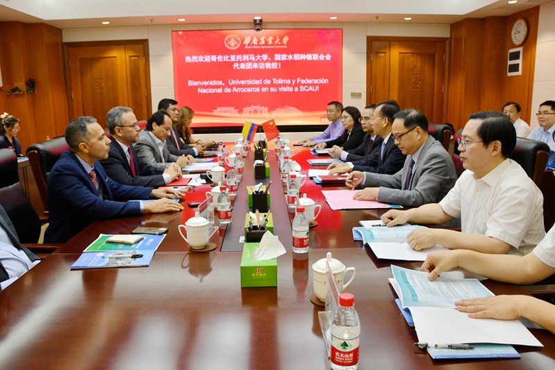 On April 16th, a delegation from the University of Tolima in Colombia and the Colombian National Federation of Rice Growers visited SCAU to jointly inaugurate the China-Colombia Rice Joint Center. The event was attended by Hernán Vargas Martín, Consul General of Colombia in Guangzhou, and Omar Albeiro Mejía Patiño, President of the University of Tolima. Li Fengliang, the Party Committee Secretary of SCAU, received the delegation, and Qiu Rongliang, the Vice President, presided over the symposium.